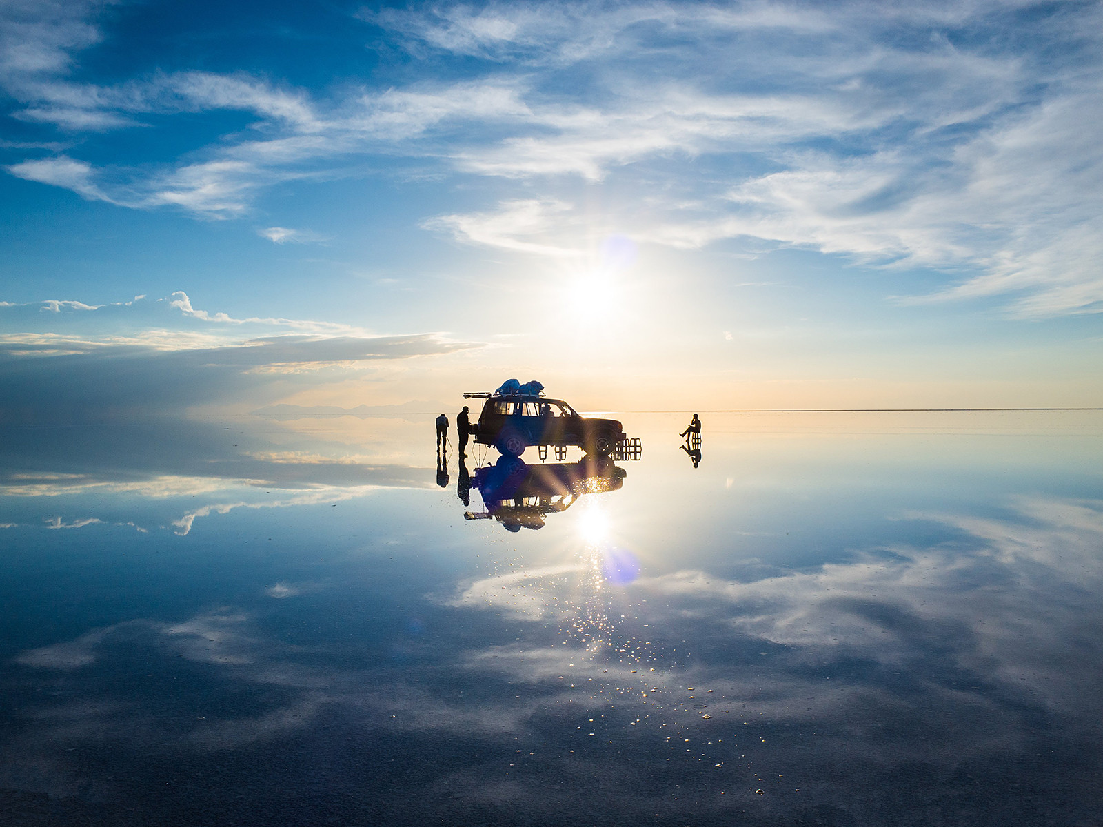 玻利维亚西部高原上的乌尤尼,是世界上最大的盐湖。每年冬季,乌尤尼盐湖都会被雨水注满,形成一个浅湖;而到了夏季,湖水干涸,便留下一层以盐为主的矿物硬壳。
