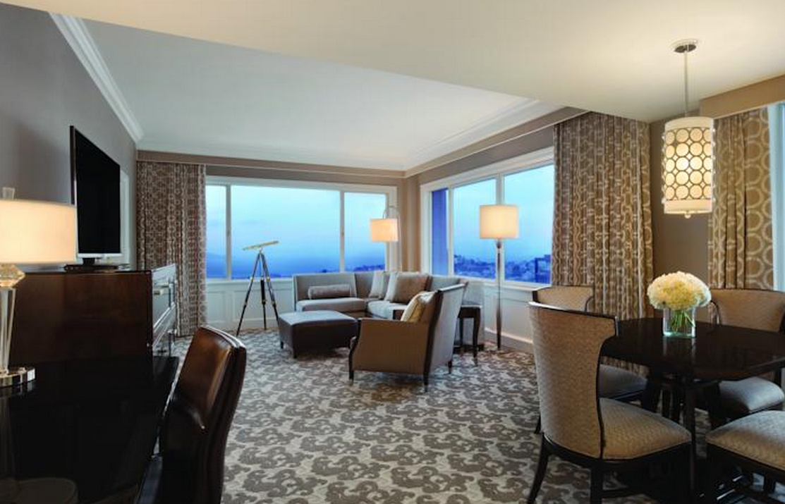 The San Francisco Fairmont酒店的部分客房或套房享有风景如画的海湾或城市的景致。精选套房享有科伊特塔(Coit Tower)、金门大桥(Golden Gate Bridge)、海湾大桥(Bay Bridge)、泛美金字塔(Transamerica Pyramid)以及天使岛(Angel Island)的全景。