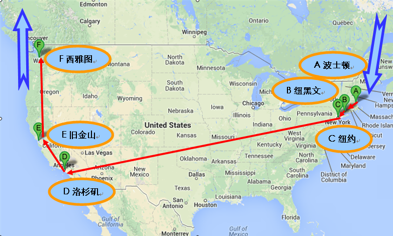 总体线路:波士顿—纽黑文—纽约—洛杉矶—旧金山—西雅图