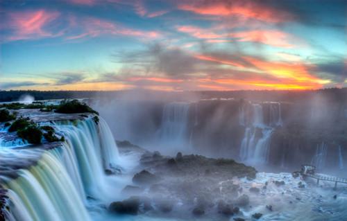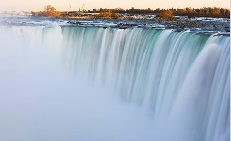 被称为世界七大奇景之一的尼亚加拉大瀑布位于加拿大和美国交界的尼亚加拉河上,它那丰沛而浩瀚的水汽和磅礴的气势,使所有前来观赏的游人都为之震撼。尼亚加拉河是连接伊利湖和安大略湖的一条水道,河道上横亘着一道石灰岩断崖,水量丰富的尼亚加拉河经此,骤然陡落,水势澎湃,声震如雷,有如千军万马,惊心动魄,激起的千层水花,水雾迷漫,将周围一切都掩于其中。