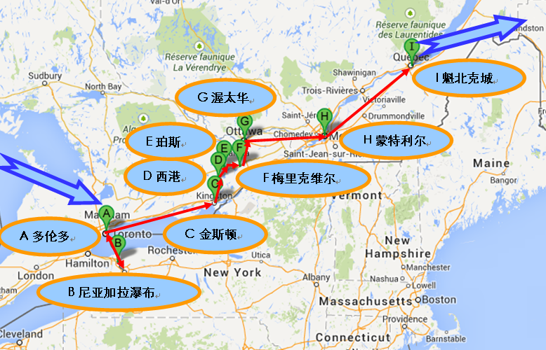 总体线路:多伦多—金斯顿—西港小镇—珀斯—梅里克维尔—渥太华—蒙特利尔—魁北克城