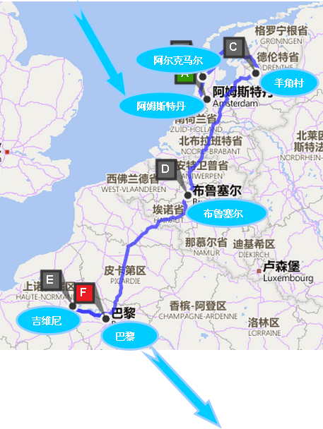 线路:阿姆斯特丹—阿尔克马尔—羊角村—布鲁塞尔—吉维尼—巴黎