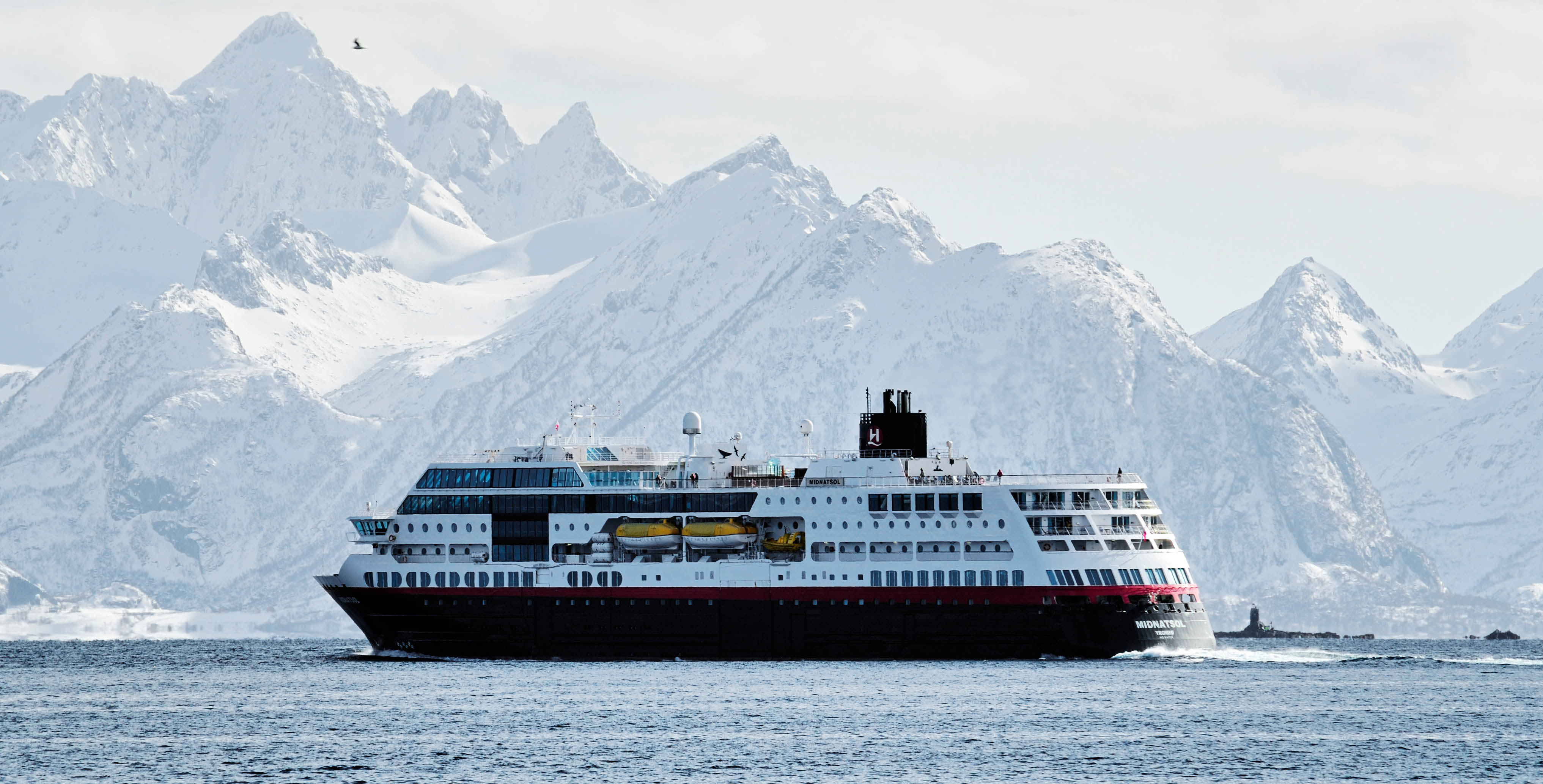 午夜阳光号(MS Midnatsol)于2003年4月15日首航,总吨位1.6万吨,载客量500人,船体长135m,船体宽21.5m,甲板楼层9层,船速15节。