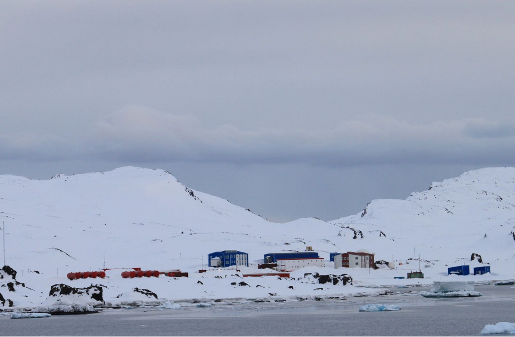 天堂湾岸边有几座咖啡色的小木屋,一块标志板上写着:南纬64度53分—西经62度53分,国旗显示这是一所阿根廷在南极的科学考察站。