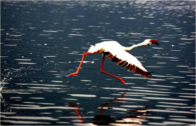 在非洲的小火烈鸟群是当今世界上最大的鸟群,每年春季,上百万只火烈鸟迁徙至温热的纳库鲁湖和博格里亚湖,使这里成为粉色海洋。傍晚时分,夕阳西下,霞光铺满整个湖面,火烈鸟成群觅食腾飞,翩翩起舞跳起水上芭蕾,惊起湖水波澜迤逦,蔚为壮观。