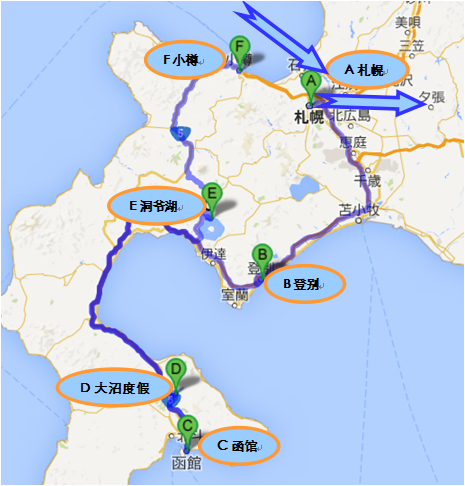总体线路:札幌——登别——函馆——大沼度村——洞爷湖——小樽