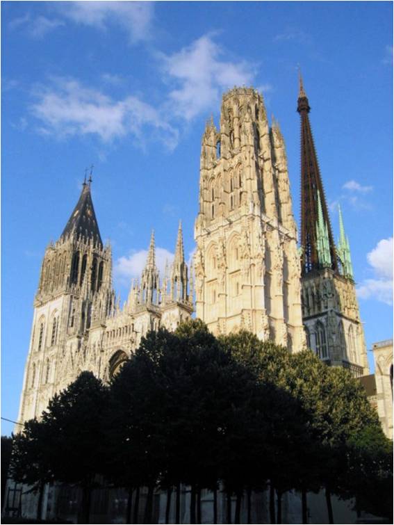 鲁昂大教堂(Cathedrale Notre Dame)的巨大身影在晨曦、中午、黄昏、阴霾、丽日下变幻着迷人的色彩,还曾经得到莫奈的画笔亲睐。他以不同时间、角度观察大教堂的光辉、线条,画出了30多幅系列教堂图,“画出了生命在光线变幻的时时刻刻所呈现出的永恒美”。这是一首对古老教堂抒发的绝唱。