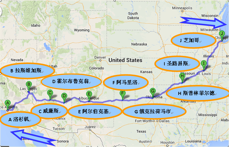 总体线路:洛杉矶—拉斯维加斯—威廉斯—霍尔布鲁克—阿尔伯克基市—阿马里洛市—俄克拉荷马市—斯普林菲尔德—圣路易斯—芝加哥