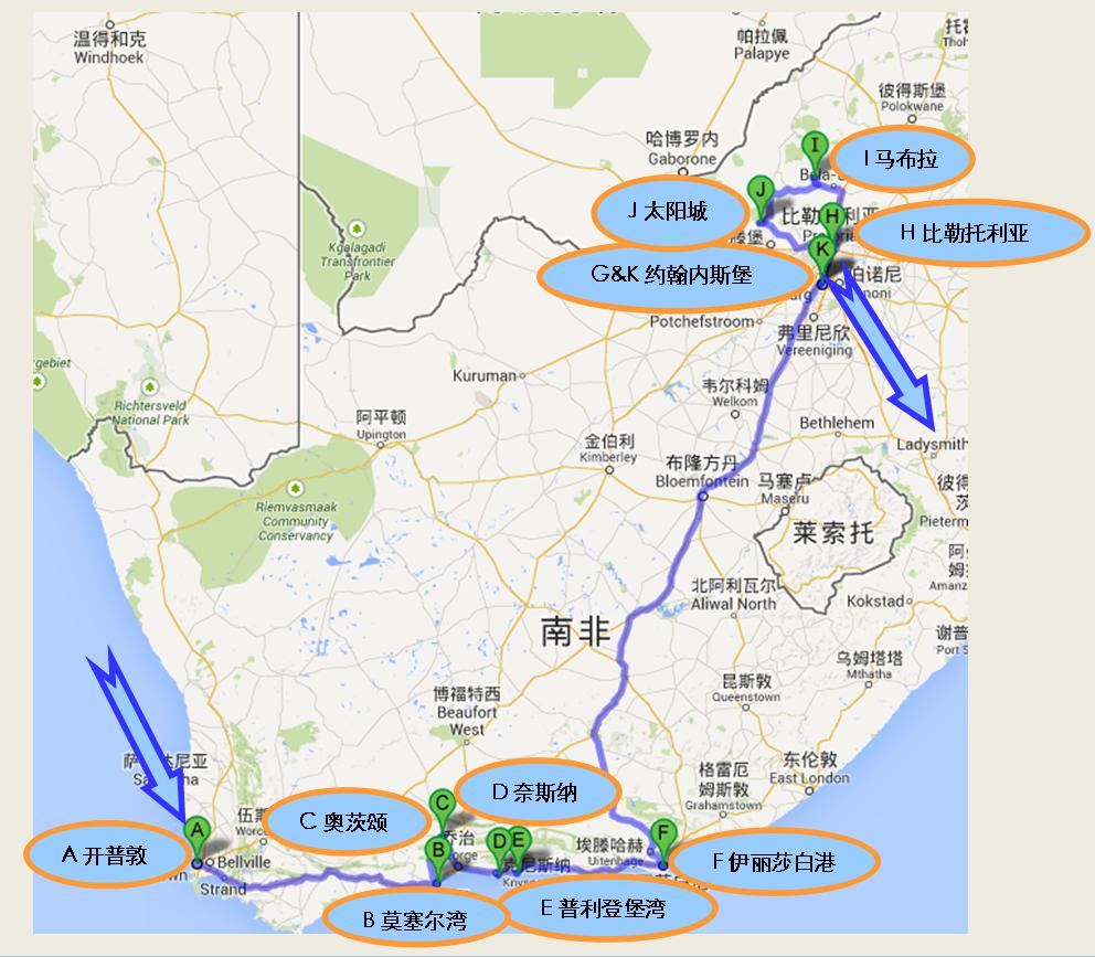 总体线路:开普敦—约翰内斯堡—比勒托利亚—马布拉—太阳城—约翰内斯堡