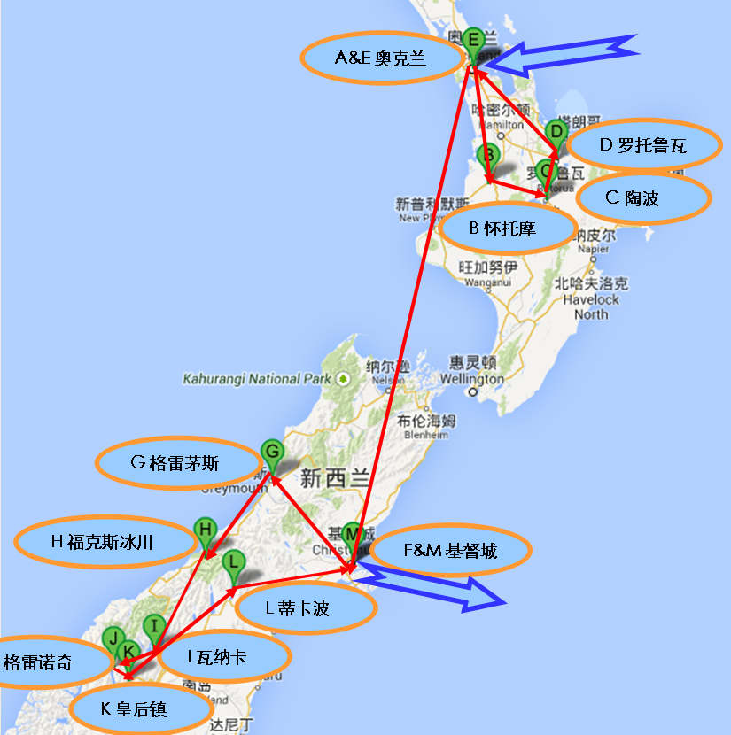 总体线路:奥克兰—怀托摩—陶波—罗托鲁瓦—奥克兰—基督城—格雷茅斯—福克斯冰川—瓦纳卡—格林诺奇—皇后镇—蒂卡波湖—基督城