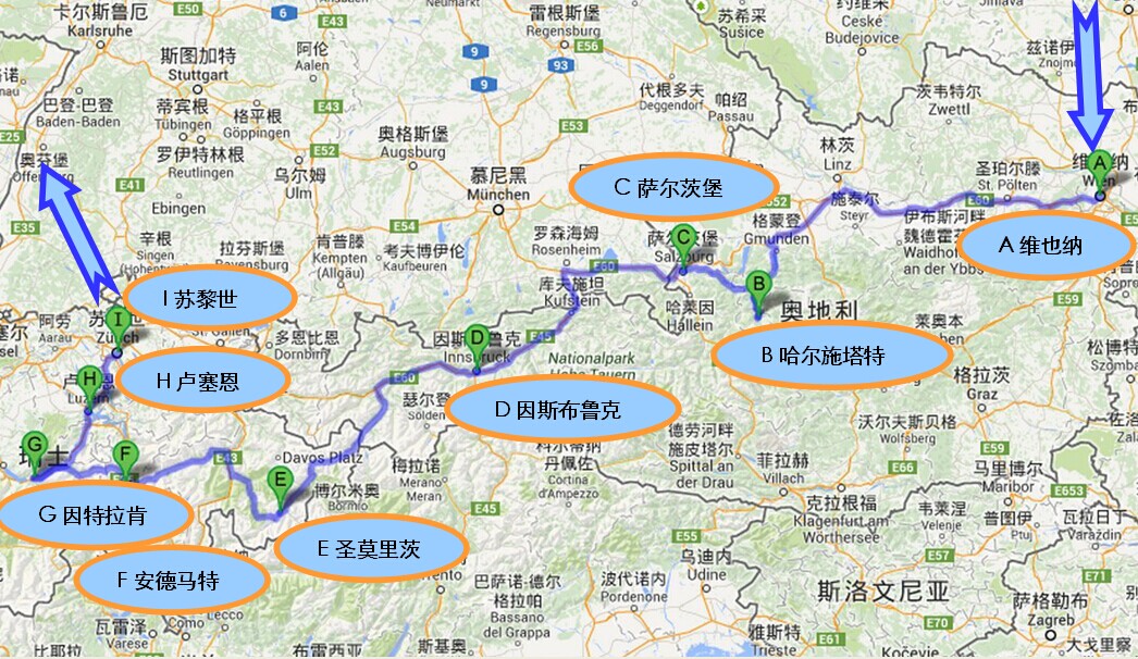 总体线路:维也纳——萨尔茨堡——因斯布鲁克——因特拉肯——卢塞恩——苏黎世