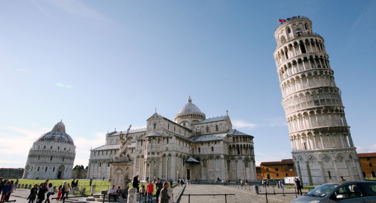 乘车前往比萨,参观奇迹广场上的比萨斜塔——设计为垂直建造,但是在工程开始后不久便由于地基不均匀和土层松软而倾斜。由于它的倾斜以及建筑特色使得比萨斜塔有着独一无二的美丽。比萨大教堂及★博物馆,★比萨墓园。