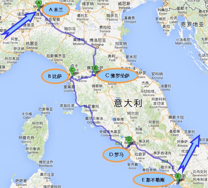 总体线路:米兰——佛罗伦萨——比萨——罗马——那不勒斯